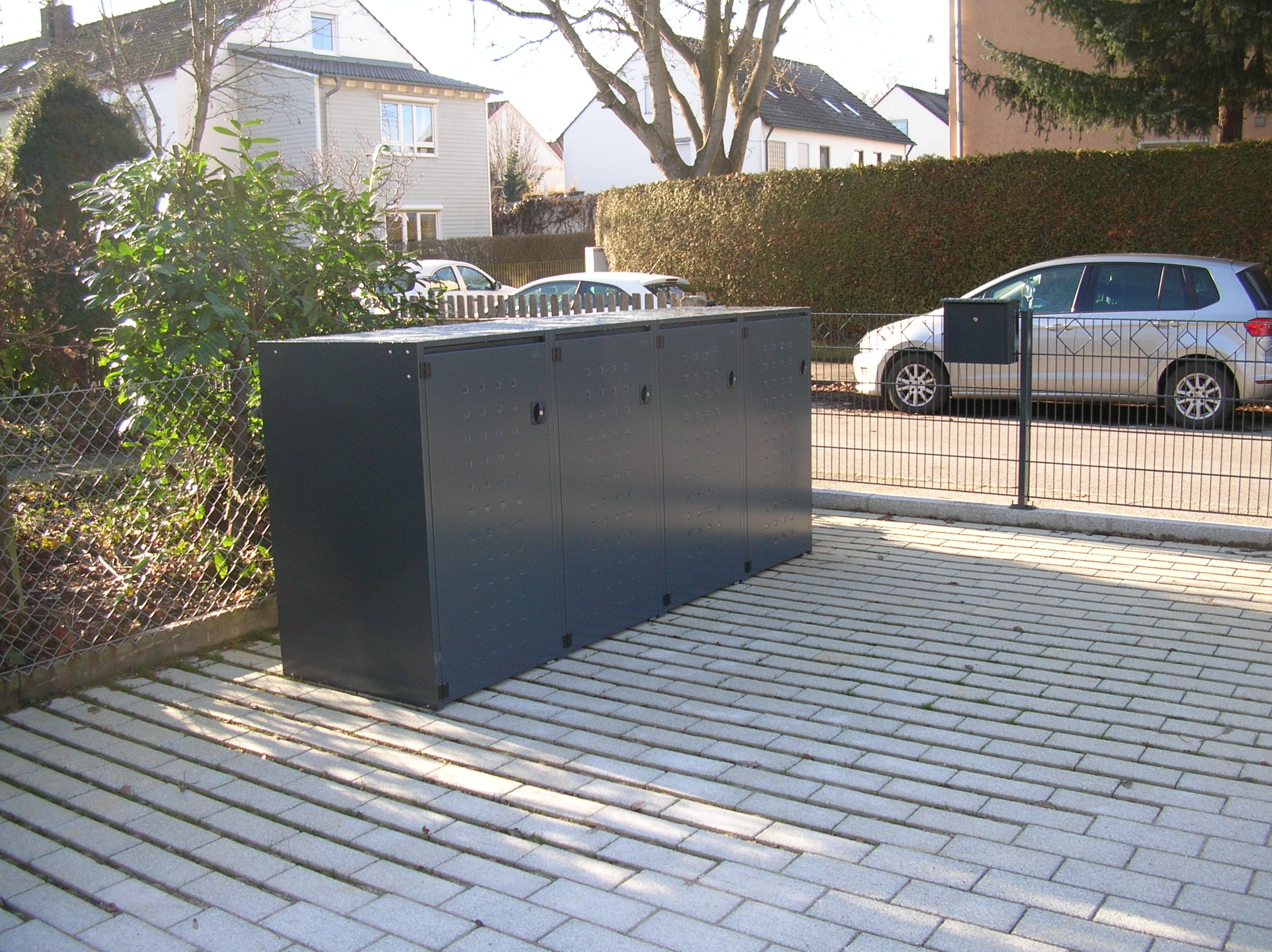 - Größe 4 x 240l, Material verzinkter Stahl in RAL 7016 Anthrazit, Dachart Kippdach, Tür T-Design geprägt, Gewicht ca. 224kg , Lieferzustand: Als Bausatz mit Montageanleitung