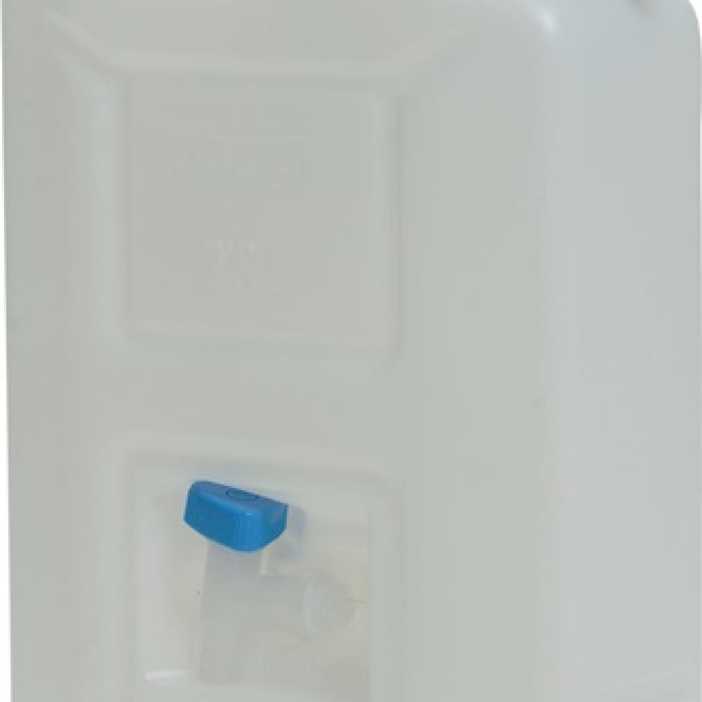aus HD-PE · UV-Schutz · lebensmittelbeständig · mit integriertem Ablasshahn · Füllöffnung Innen-Ø 48 mm, Außen-Ø 65 mm · mit Gewindestopfen und Breitgewinde 22 mm auf der Schmalseite · stapelbar, mit Auslaufhahn · Farbe natur